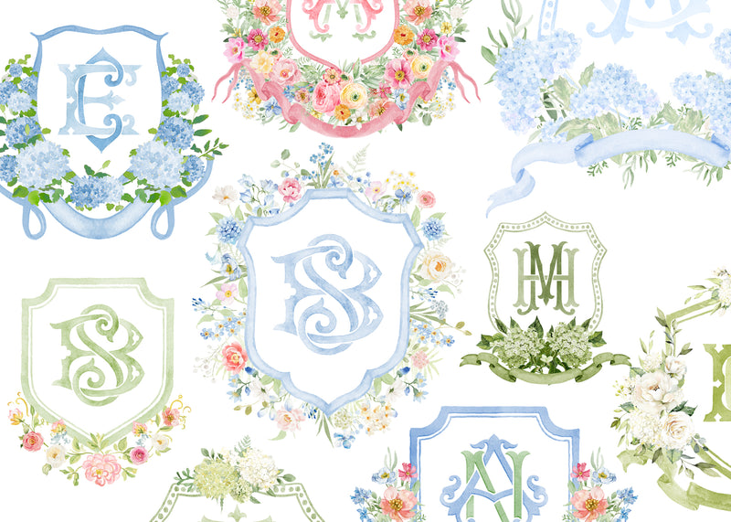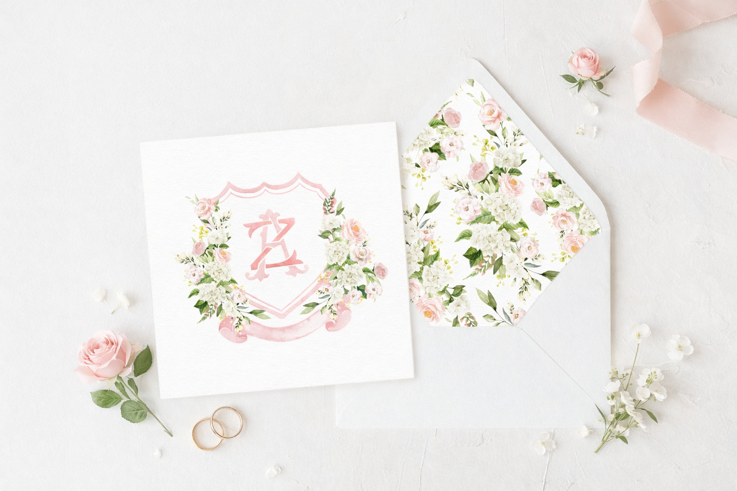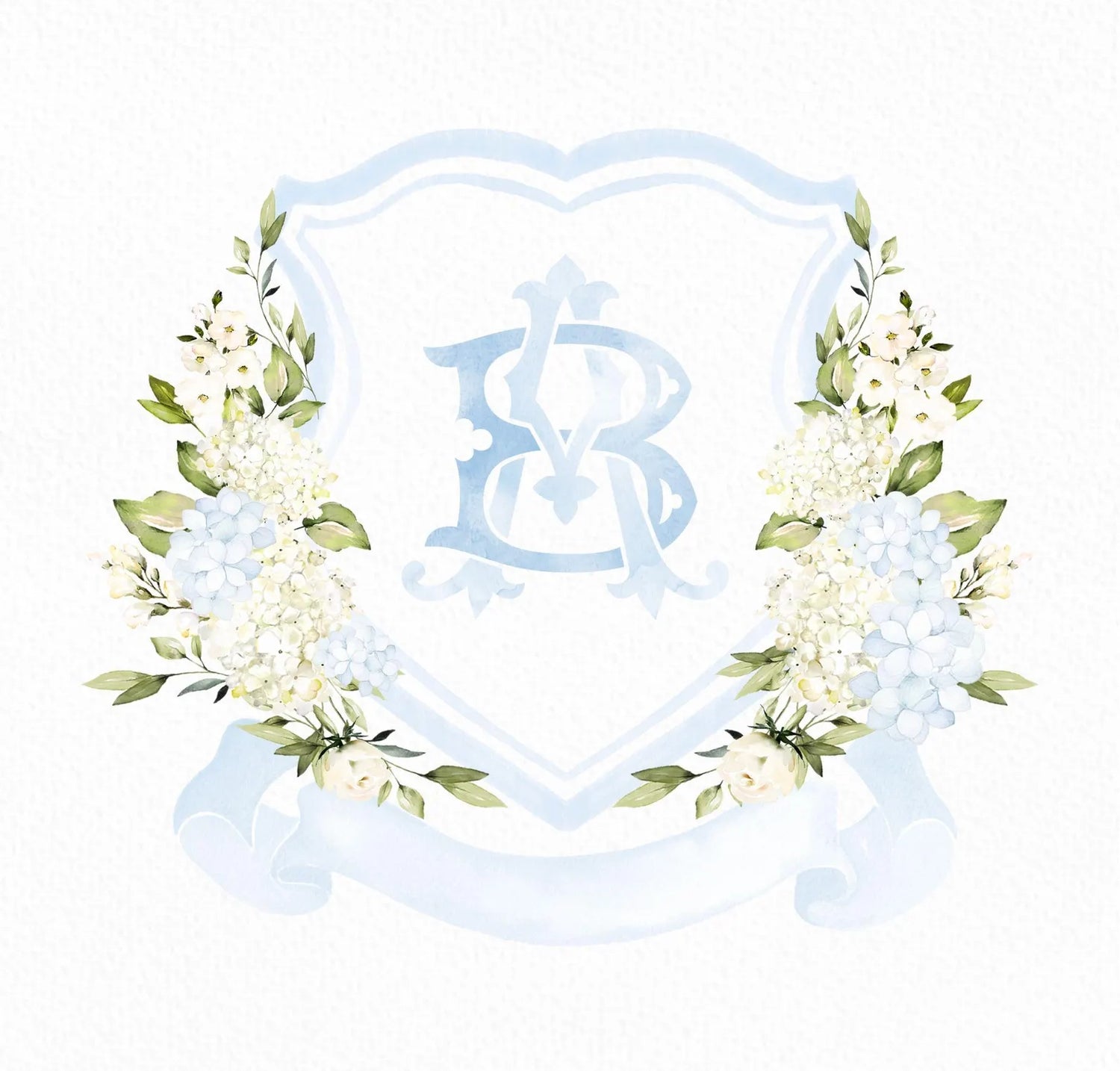 A soft and romantic wedding crest illustrated in delicate watercolor tones. Featuring organic brush strokes and graceful details, this design adds an artistic and heartfelt touch to your wedding paper goods. Ideal for invitations, welcome signs, menus, and modern wedding branding.