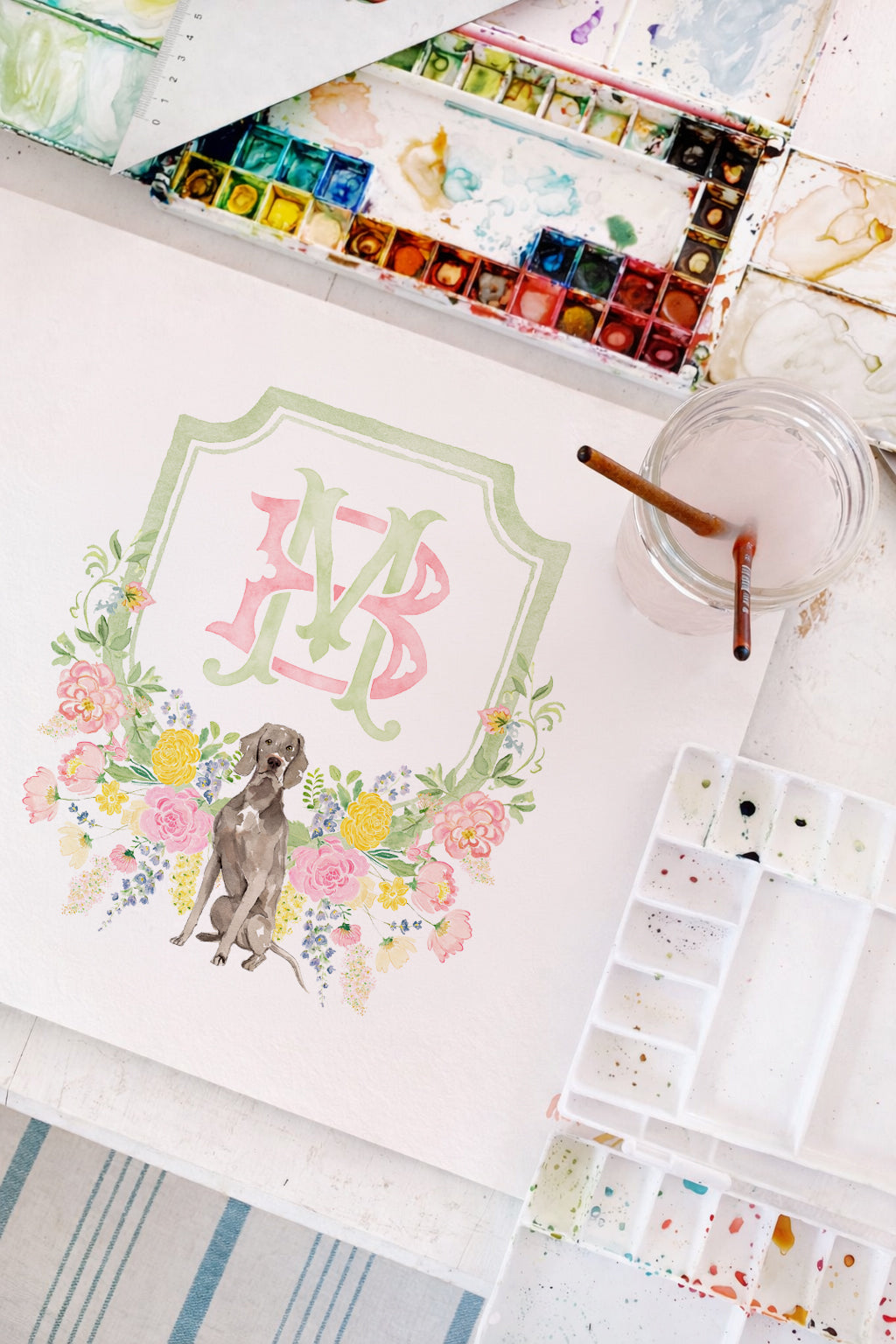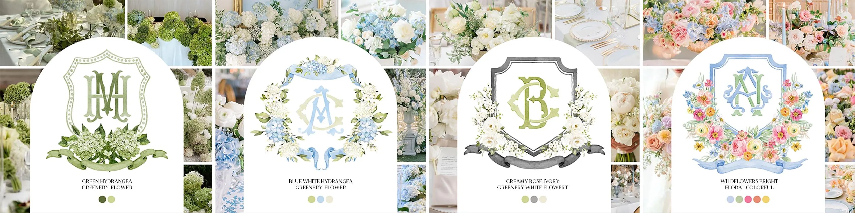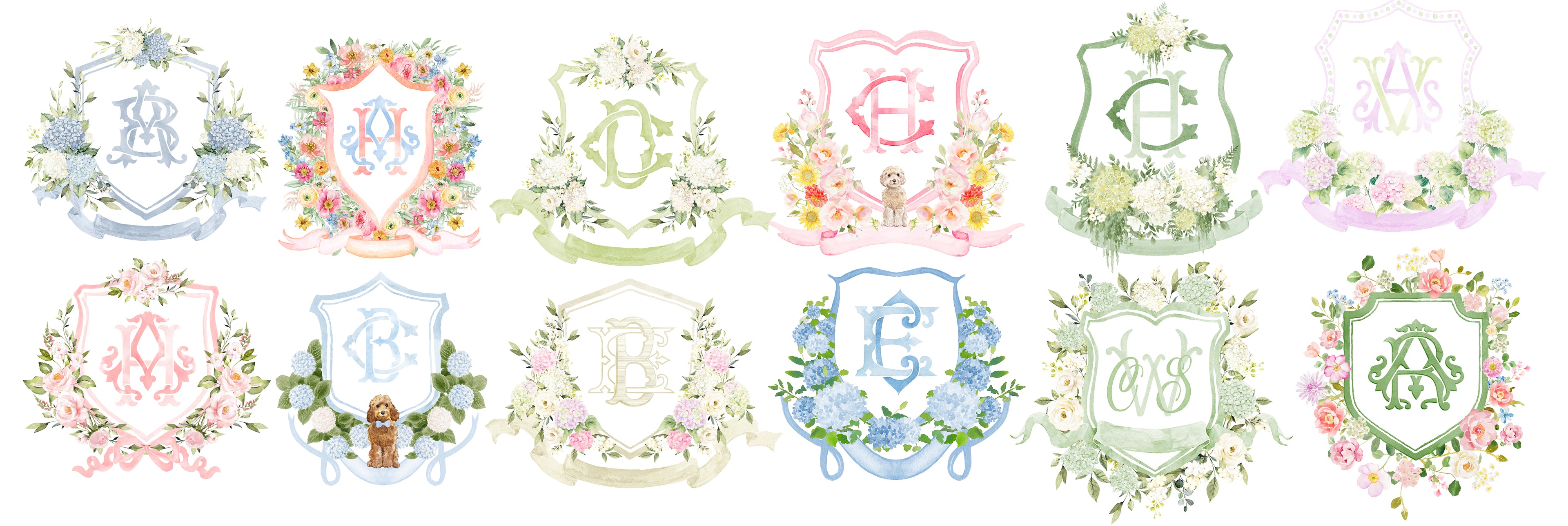 A soft and romantic wedding crest illustrated in delicate watercolor tones. Featuring organic brush strokes and graceful details, this design adds an artistic and heartfelt touch to your wedding paper goods. Ideal for invitations, welcome signs, menus, and modern wedding branding.